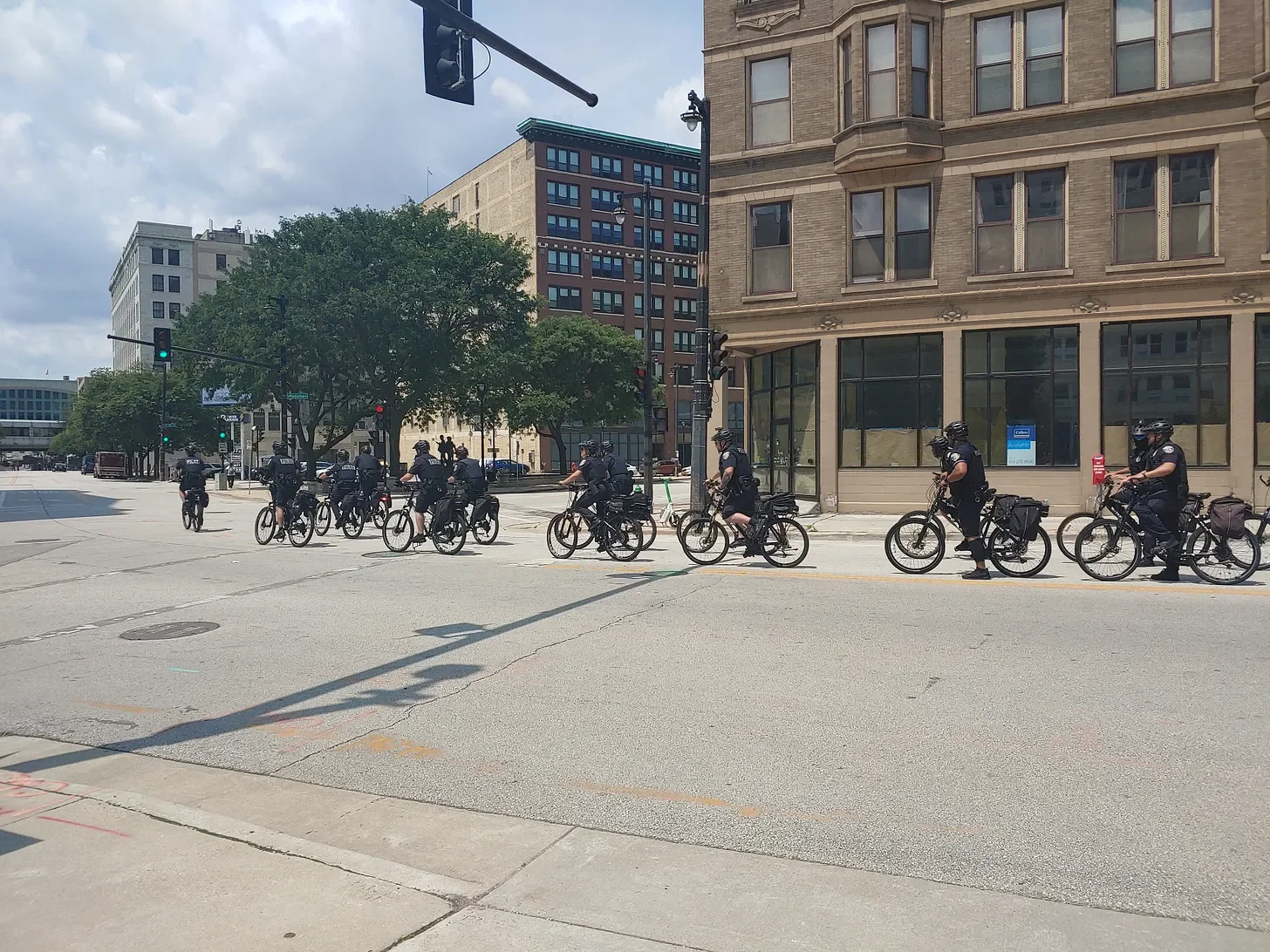 One of several groups of police for the 2024 RNC Convention in Milwaukee biking down Water Street, the week leading up to the event.