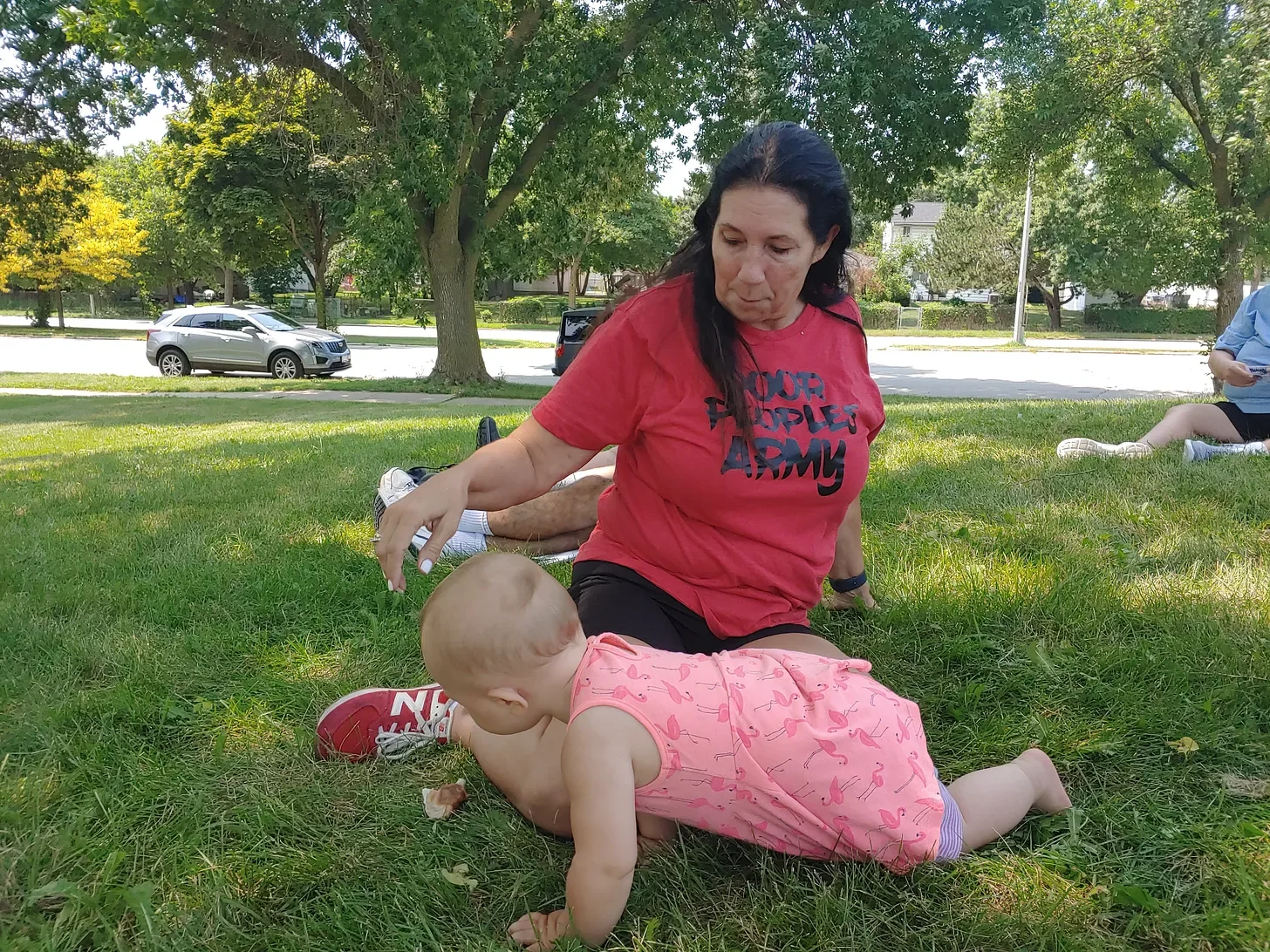 Cheri Honkala after recounting her story. The group was gathering for the first day of the march to Chicago. My baby crawling around her to get what looks like a muffin wrapper.