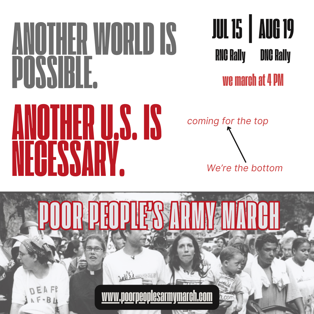 On July 15, 2024 in Milwaukee, WI, opening day of the Republican National Convention (RNC), the Poor People’s Army will march on the RNC to challenge the corporate “Liberals” and “Conservatives,” and chart a third path for our future. Then they will continue their march 100 miles to Chicago, IL, arriving on August 19, 2024 for opening day of the Democratic National Convention (DNC). The Poor People’s Army March will stop in cities and towns along the way, sharing a vision of poor and working people building power independent of these two dead-end corporate political parties. The Poor People’s Army will collect and deliver evidence of Crimes against Humanity, and demand an end to preventable atrocities caused by the Republican and Democratic Parties and the corporations that control them. For 3 decades, PPEHRC / Poor People’s Army has been reclaiming the basic necessities of life– with free food distribution & housing takeovers of abandoned properties. Since 2000 they have led marches of tens of thousands of people on the RNC and DNC during election years.